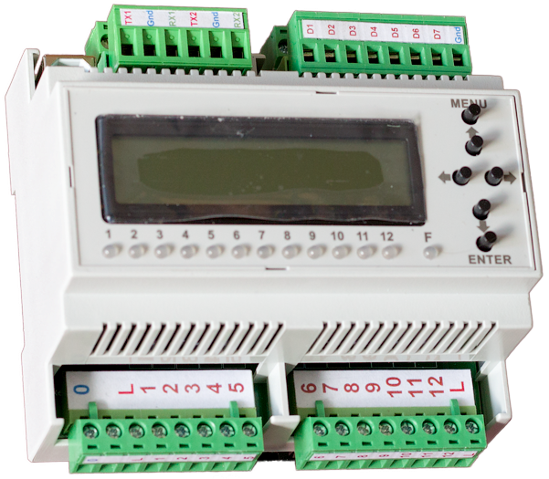 - Valdiklis turi dvylika 220V 2A išėjimų, skirtu tiesiogiai valdyti cirkuliacinius siurblius, trieigio (ketureigio) vožtuvo pavaras, servo pavaras, elektrines termogalvas ir .t.t.. Bet kuri valdiklio išvadą galima priskirti bet kuriam išėjimui, užsiduoti išėjimo inversiją;