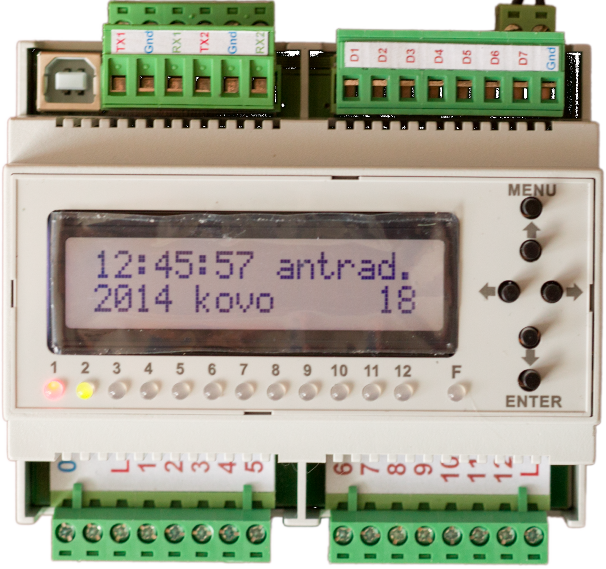 - Operuoja 32 išėjimais, dvylika ant paties valdiklio, likusius galima nukreipti į išplėtimo modulius arba universalius išvadus D1...D7;