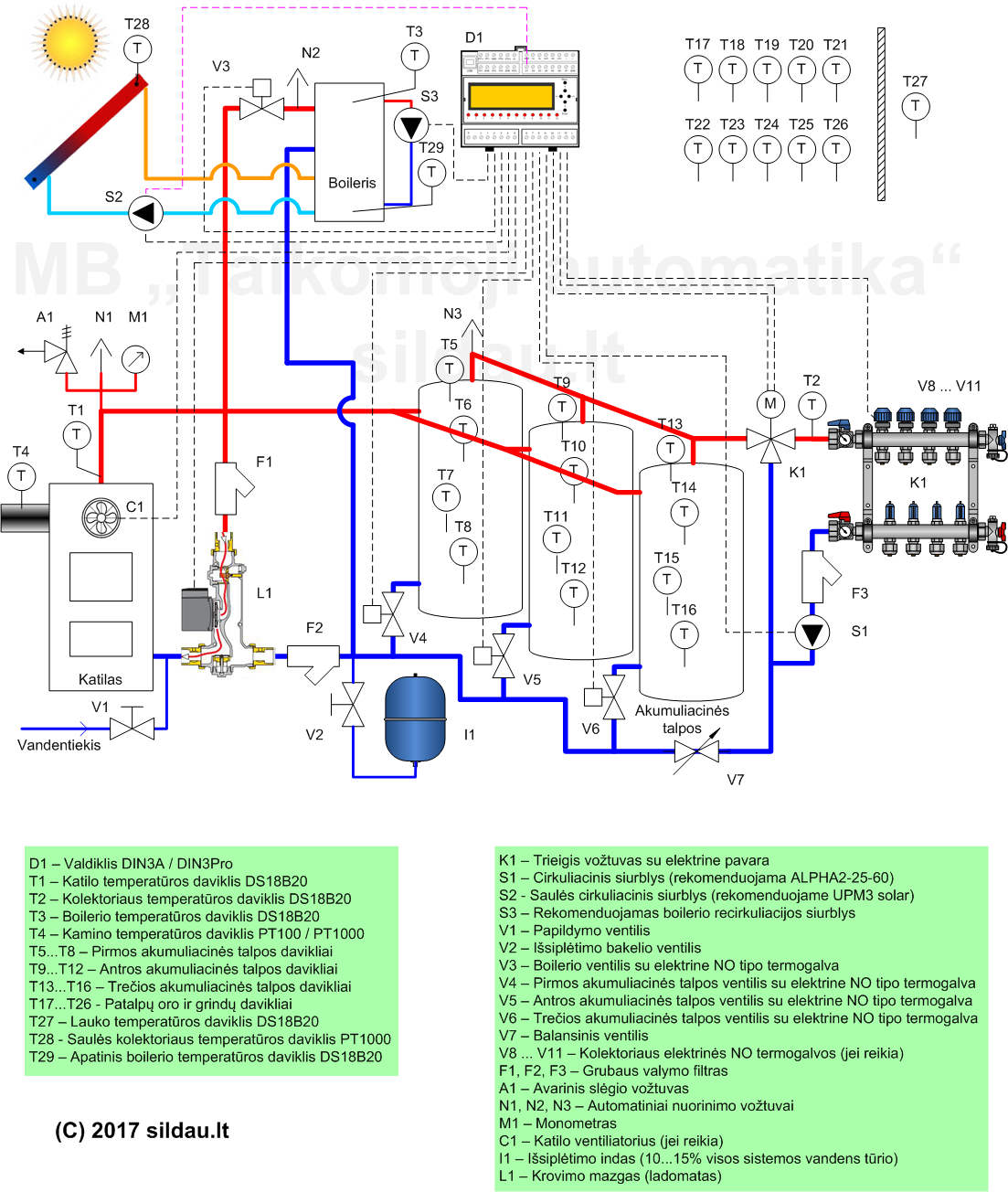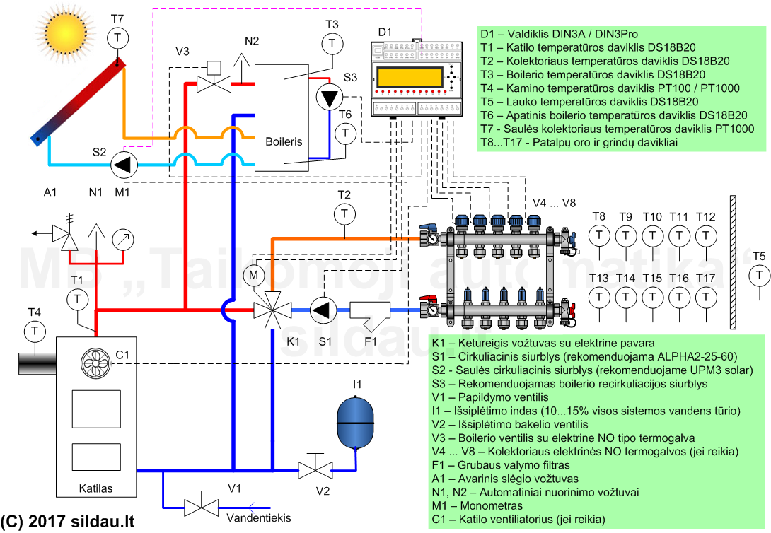 Skirta valdyti katilinę su bet kokio tipo katilu: kieto kuro, granuliniu, dujiniu, šilumos siurbliu ir kitais. Valdiklio išėjimų pakanka valdyti trieigio vožtuvo pavarą (naudojami du išėjimai), cirkuliacinį siurblį, boilerį, jei reikia, katilo ventiliatorių, saulės kolektoriaus siurblį (galima naudoti tiek "klasikinį" siurblį, valdoma per 220V išėjimus, arba šiuolaikinį UPM3 Hibrid solar, valdomą PWM signalu per D1...D4 išvadus), akumuliacines talpas (iki trijų talpų). Kamino daviklis būtinas dėl ladomato ir akumuliacinės algoritmų. Prie apatinio boilerio gyvatuko pajungtas saulės kolektorius, katilas boilerį šildo per viršutinį gyvatuką. Tai tradicinė kombinuoto boilerio jungimo hidraulinė schema. Tokiu būdu katilas gali šildyti tik viršutinę boilerio dalį, neišnaudojant jo tūrio. Šiai problemai spręsti skirtas siurblys S3, kuris iš boilerio viršaus sušildytą karštą vandenį permeta į boilerio apačią, tad užkaitinamas visas tūris. Šio siurblio valdymui valdiklyje naudojamas specialus, mūsų sukurtas algoritmas. Akumuliacinės talpos jungiamos per elektrotermines pavaras, kurios leidžia realizuot mūsų sukurtus talpų kaskadavimo ir "katilo išsiurbimo" algoritmus. Prieš abu ladomato įėjimus rekomenduojame dėti filtrus, be jų apsinešus ladomato kapsulei pastaroji gali prilipti, ko pasėkoje arba katilas negalės užkaist arba, kas blogiau, perkais.D1 – Valdiklis DIN3A