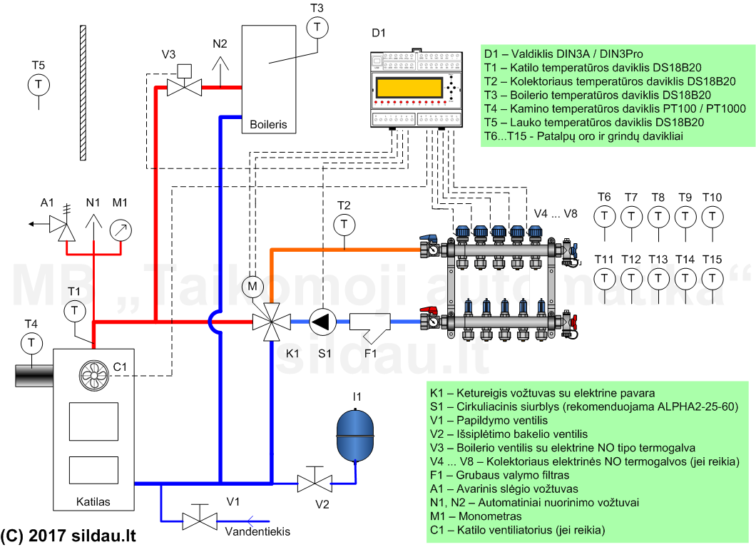 T8...T17 - Patalpų oro ir grindų davikliai. Jei naudojamas grindinis šildymas, pats efektyviausias valdymo metodas naudojant ir grindų ir oro daviklius, bet galima valdyti ir su vienu.