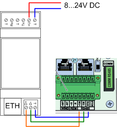 Šis modulis turi du prievadus: RS232 skirtas prijungti DIN3 serijos valdiklį prie lokalaus ethernet tinklo, o RS485 - jungti prie saulės elektrinių inverterių, dirbančių "aurora" protokolu (testuota su ABB PVI10, Power One inverteriais). Abu įrenginius galima jungti vienu metu.