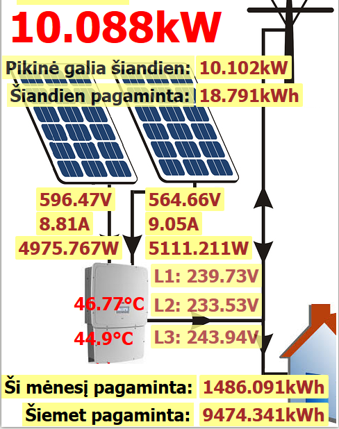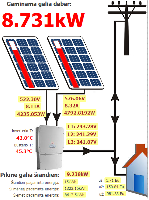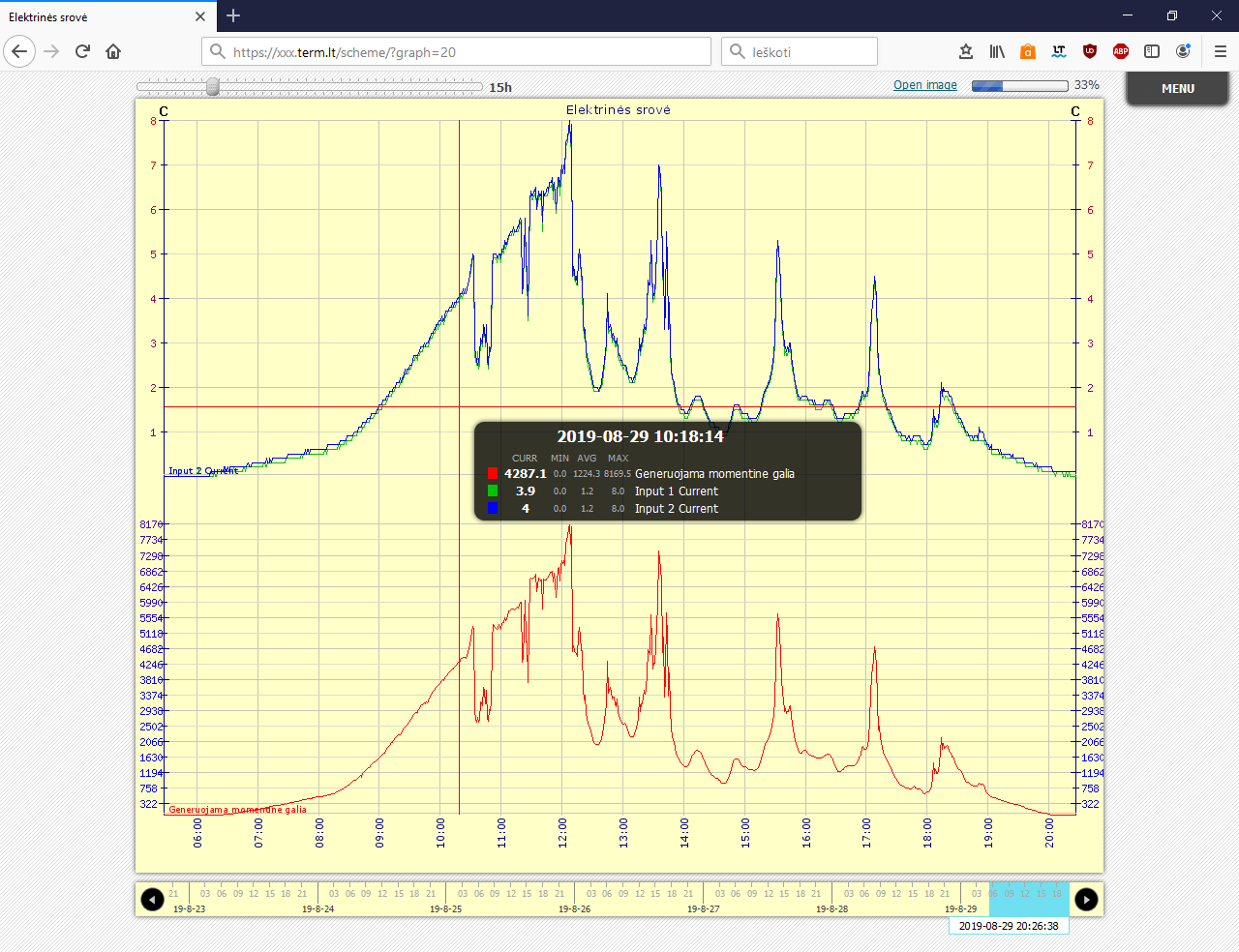 - Dienos, mėnesio ir metų pagamintos energijos kiekis.