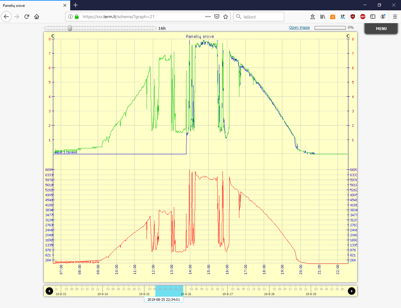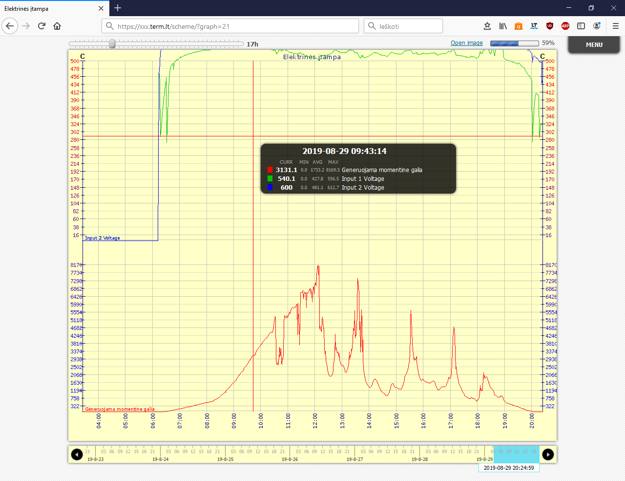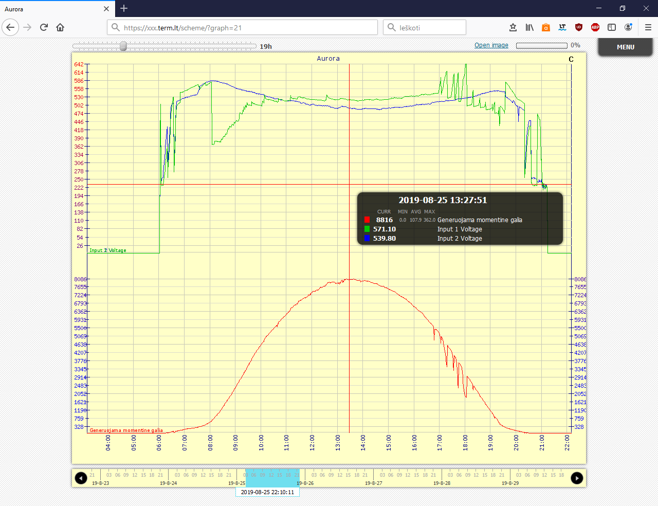 Čia matoma dienos galia ir abiejų DC įėjimų įtampos. Galia netolygi, nes diena buvo debesuota