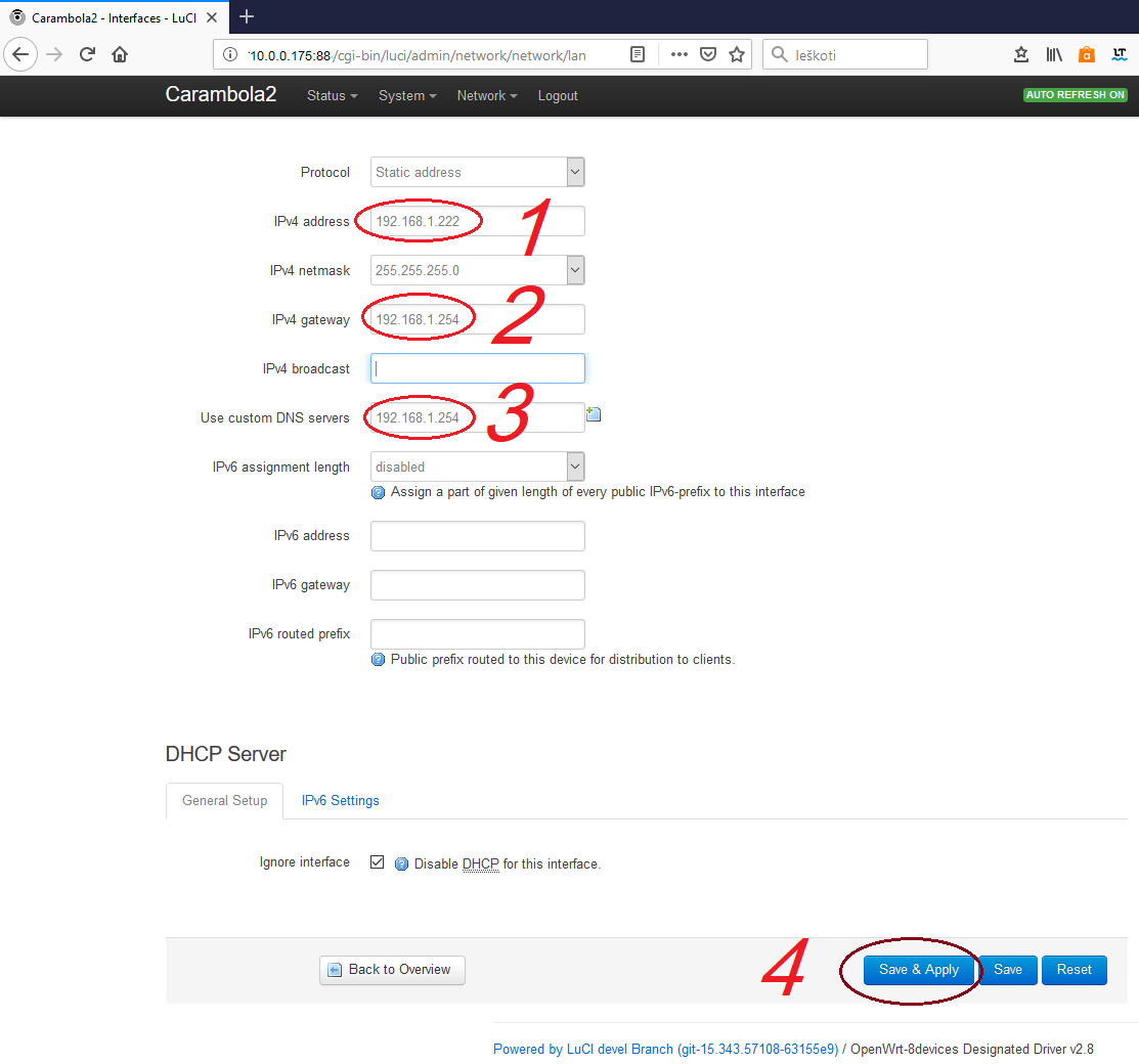2. Nurodome routerio IP adresą. IPv4 broadcast ištriname esamus skaičius.