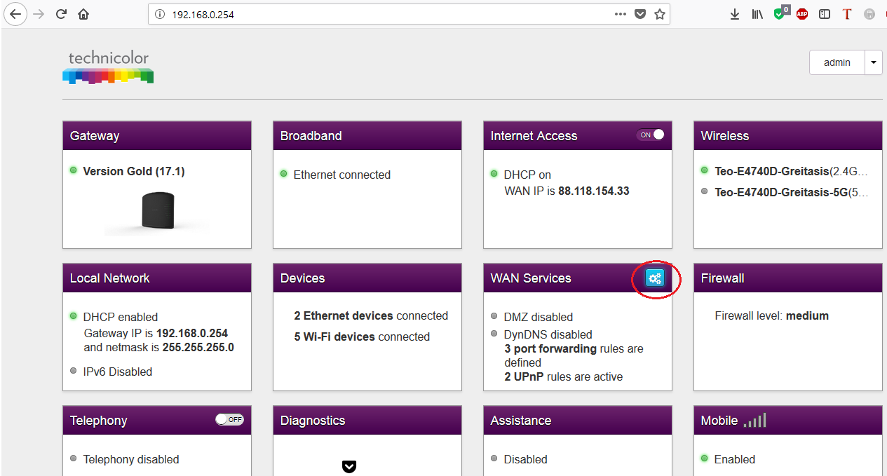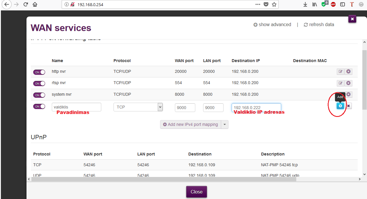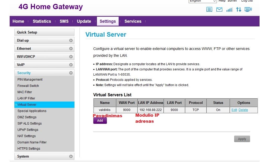 Saugumo sumetimais nenaudojami automatiniai duomenų perdavimai per debesų technologijas, tad reikia rankomis padaryti "port forwarding" iš išorės į LAN modulį. Jokiu būdu nedarykite DMZ, nes taip prie modulio prileisite visus piktavalius. Forwardinti reikia tik TCP 9000 portą į Lan modulio 9000 portą