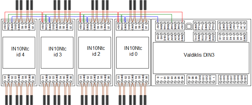Prie jo galima pajungti iki 10 vnt. NTC daviklių, o tokių modulių prie valdiklio - net iki 4 vnt. Taigi, DIN3 valdiklis gali vienu metu "matyt" iki 40 vnt. NTC daviklių. Modulis moka matuoti bet kurio tipo NTC daviklius, tereikia žinoti du daviklį apibrėžiančius parametrus T25 (daviklio varža prie 25C) ir varžos pokyčio koeficientą. Moduliai jungiasi prie 1W2 (one wire antras portas) magistralės, tuo pat metu prie magistralės galima jungti ir skaitmeninius daviklius DS18B20. Moduliai gali būti skirtingose pastato vietose, kas sumažina išlaidas instaliacijai.